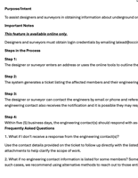 - Filing a locate request for underground or submerged utilities to be located, submitting a second request, updating or cancelling a ticket.